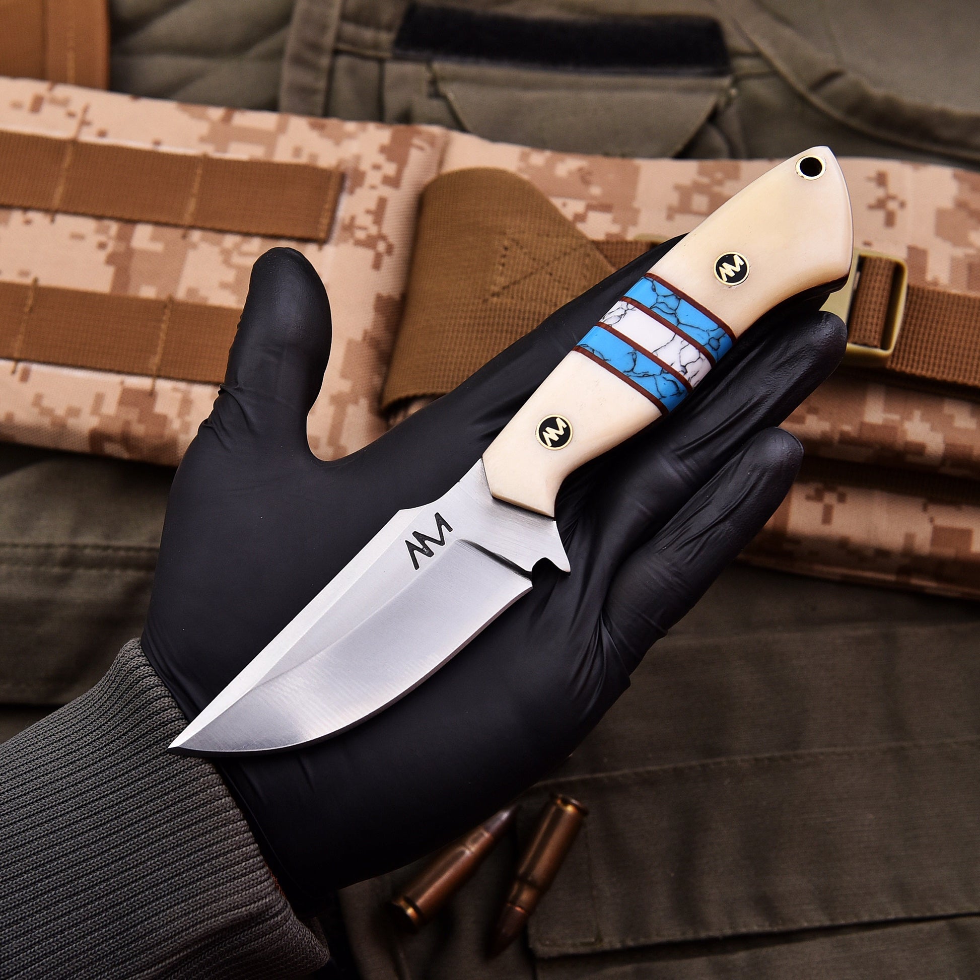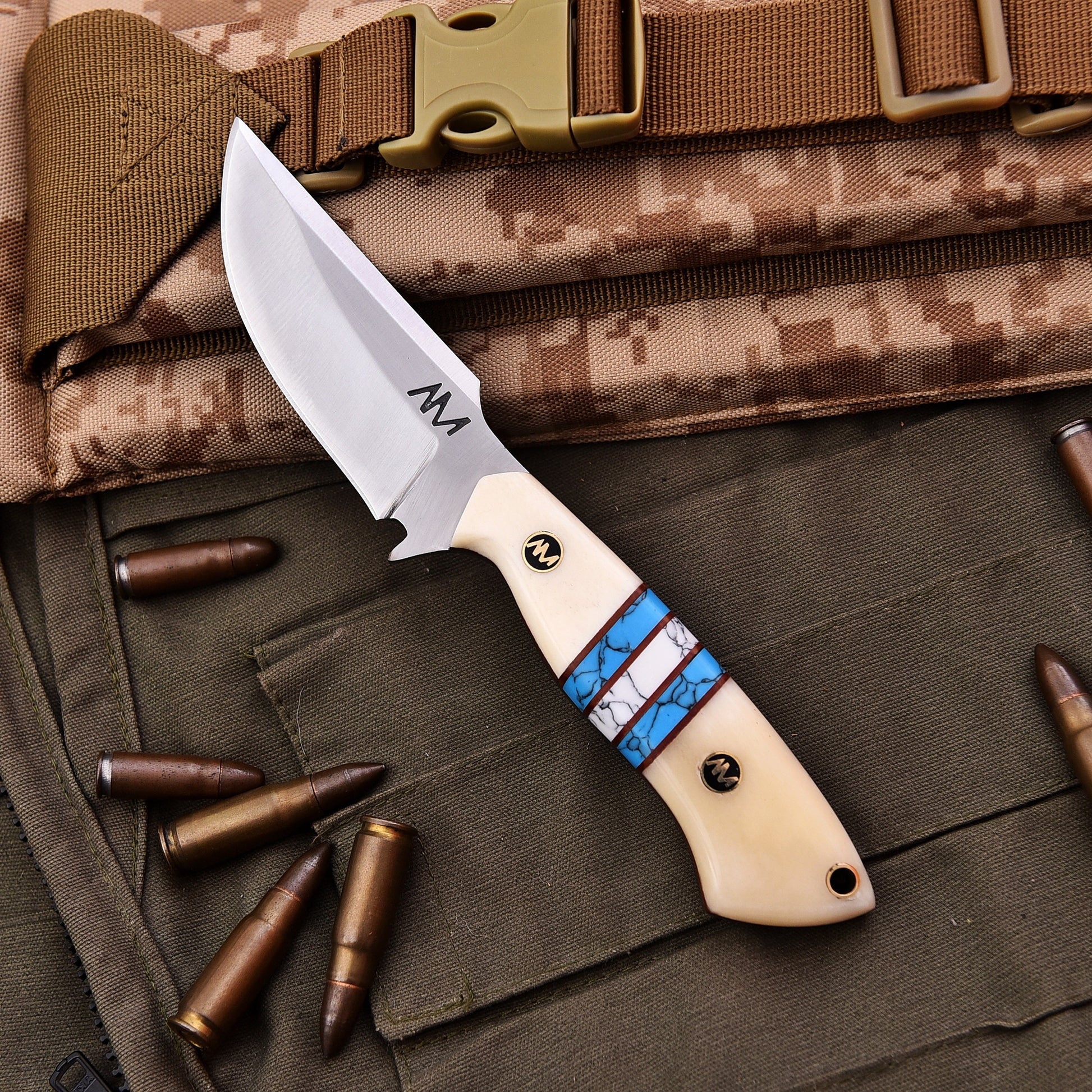 The AM Arctic is a masterfully crafted 8-inch fixed blade knife designed for hunters, campers, and outdoor adventurers who demand both performance and style. Built with precision and durability in mind, this knife isn’t just a tool—it’s a statement piece.