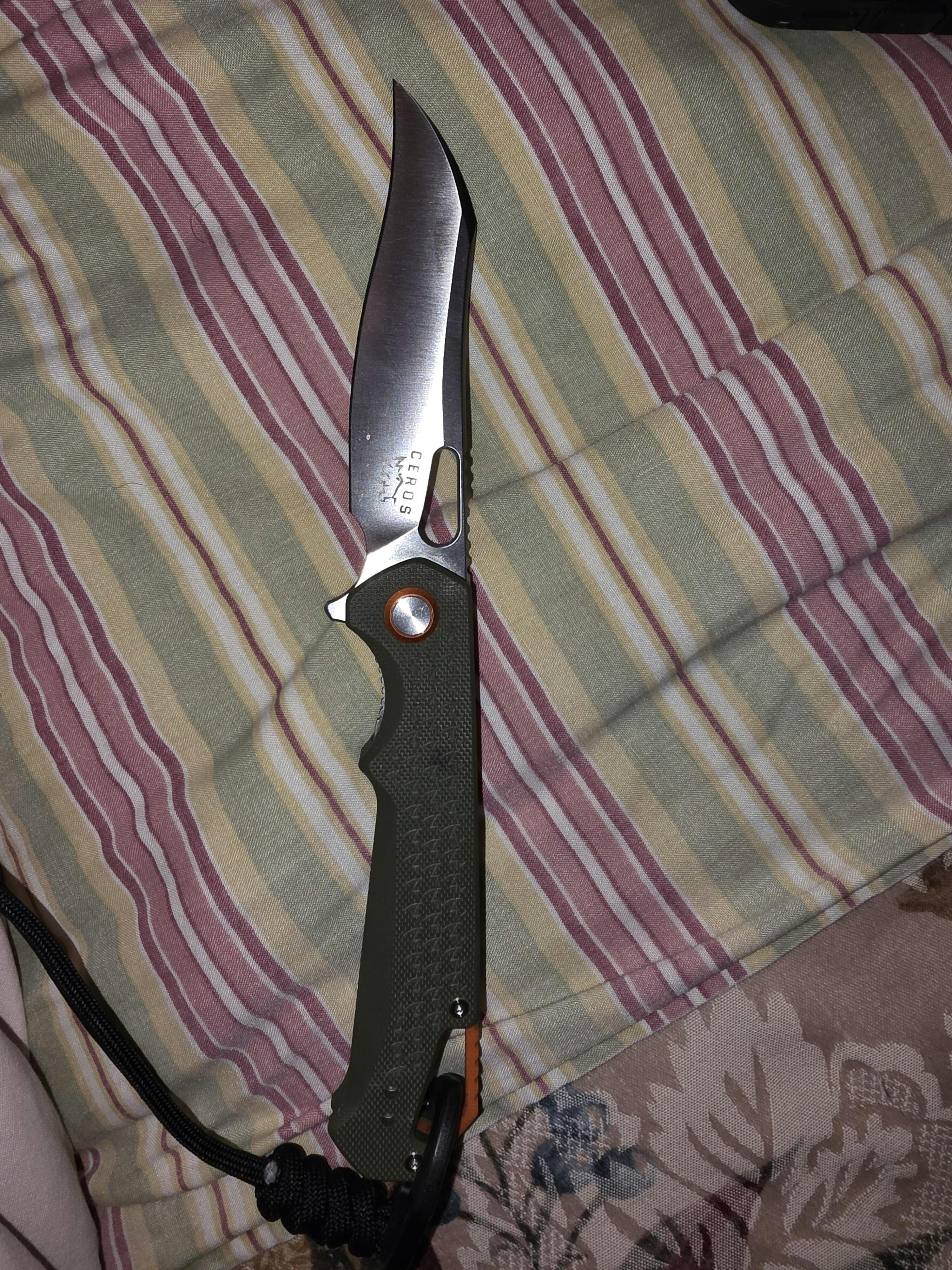 The knife is gorgeous and exactly what I was looking for. It came sharp out the box. The rhino horn shape, lanyard clip, and color are a definite plus.