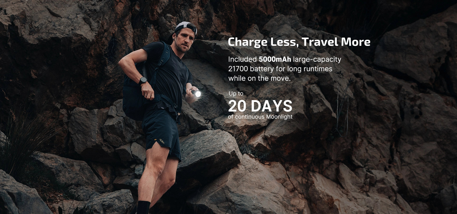 Dual Charging Options: Supports USB-C charging via the detachable base and MCC charging with an optional MCC3 cable. The 5000mAh lithium-ion battery ensures up to 20 days of continuous Moonlight.